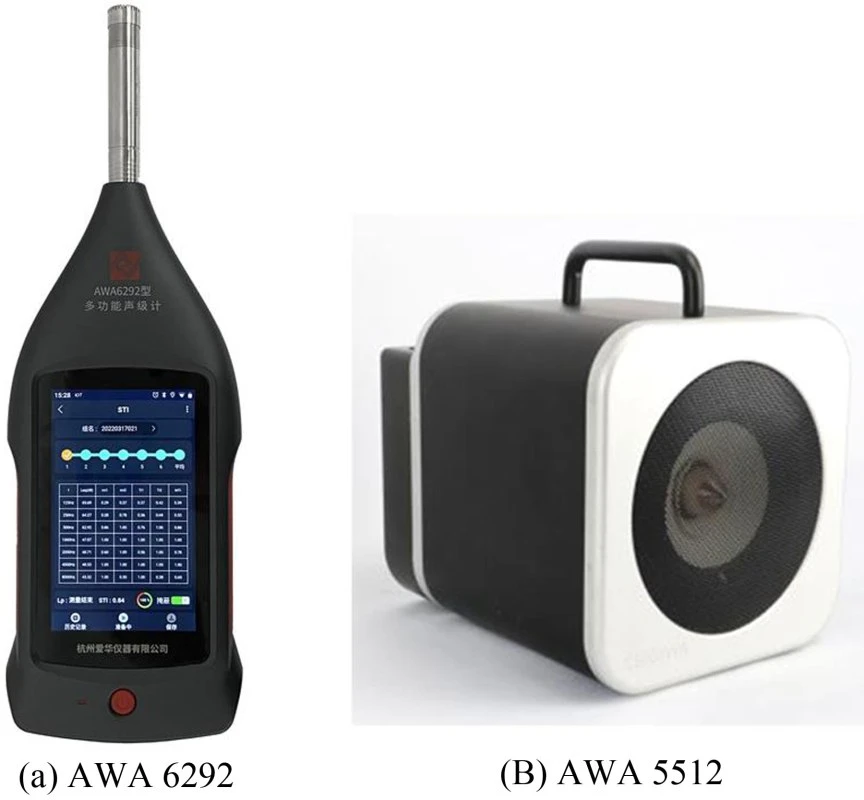 AWA6292型多功能声级计如图2(a)所示,是采用数字信号处理和物联网技术的新一代手持式声学测量仪器,性能符合GB/T 3785.1/IEC 61672-1对1级声级计和GB/T 3241.1/IEC 61260-1对1级滤波器的要求,可以选择工业噪声测量、环境噪声测量、职业卫生噪声测量和建筑声学测量等模块。当选用建筑声学测量模块时,配置总值积分测量、倍频程和1/3倍频程滤波器、混响时间测量和STIPA测量等软件模块,可以完成大多数建筑声学测量项目,尤其适用于厅堂和室内场所的声学和扩声特性测量。